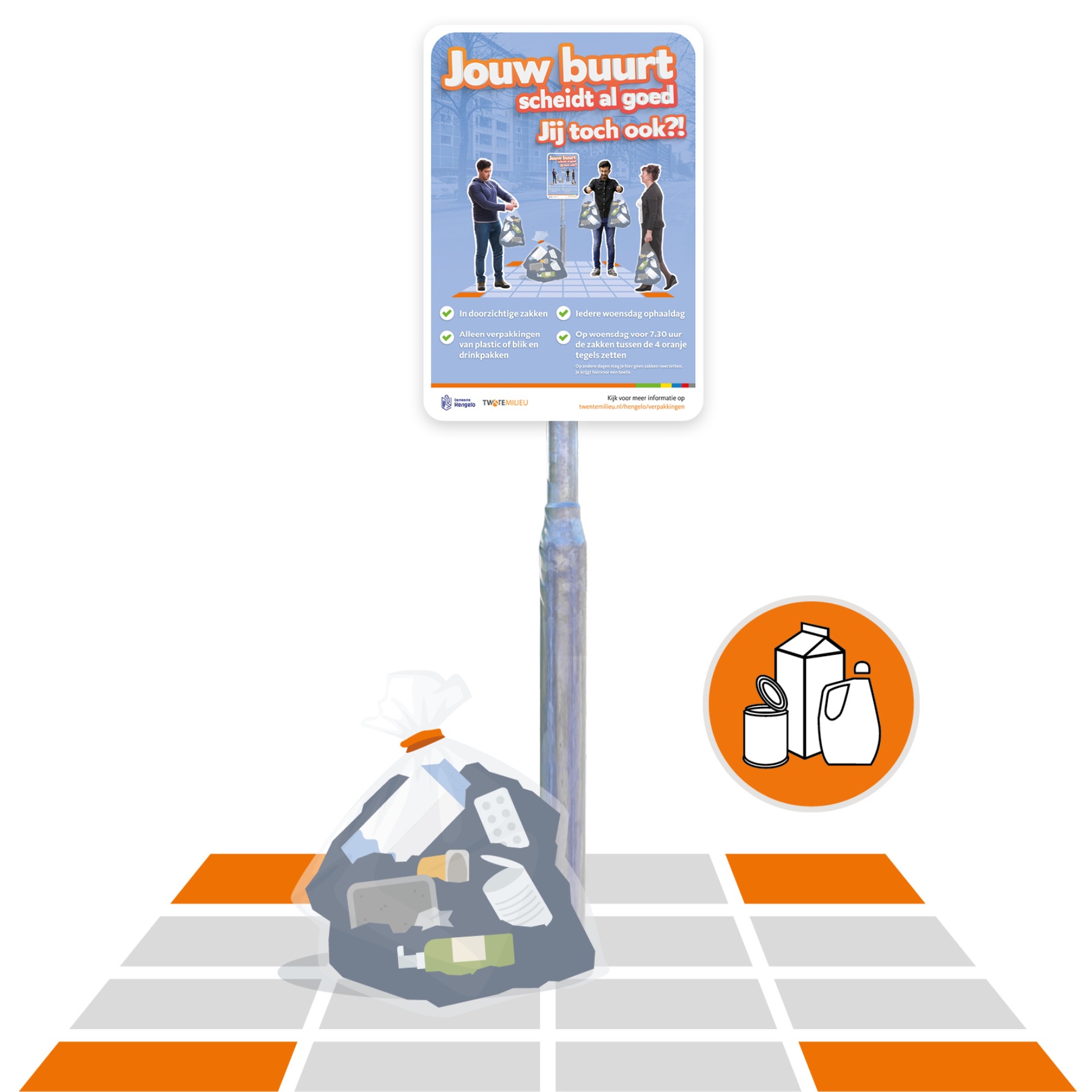 In de doorzichtige zakken kunt u verpakkingen doen van plastic, blik en drankenkartons, zoals plastic tassen, verpakkingen van vleeswaren en kaas, boterkuipjes, saladebakjes, flacons van wasmiddel, kleine plastic plantenpotten, lege blikjes hondenvoer, limonadesiroopblikken, deksels, pakken voor frisdrank en zuivel, bekers voor yoghurt, doordrukstrips van medicijnen en nog veel meer! Check de app van Twente Milieu 'welk afval waar?' Te download in de App Store (Apple) of Google Play (Android) op uw telefoon.