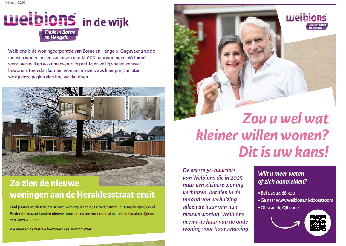 Welbions is de woningcorporatie van Borne en Hengelo. Ongeveer 25.000 mensen wonen in één van onze ruim 14.000 huurwoningen. Welbions werkt aan wijken waar mensen zich prettig en veilig voelen en waar bewoners tevreden kunnen wonen en leven. Zes keer per jaar laten we op deze pagina zien hoe we dat doen.