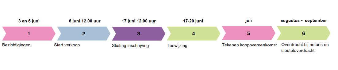 De inschrijving sluit op dinsdag 17 juni om 12.00 uur. Daarna wordt met een loting door de notaris bepaald aan wie de woningen worden toegewezen.